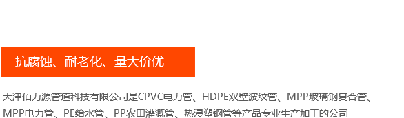 天津佰力源管道科技有限公司是熱浸塑鋼管、涂塑鋼管、MPP電力管、CPVC電力管、HDPE雙壁波紋管、MPP玻璃鋼復(fù)合管、MPP電力管、PE給水管、PP農(nóng)田灌溉管、熱浸塑鋼管等產(chǎn)品專業(yè)生產(chǎn)加工的公司,擁有完整、科學(xué)的質(zhì)量管理體系。 天津佰力源管道科技有限公司的誠(chéng)信、實(shí)力和產(chǎn)品質(zhì)量獲得業(yè)界的認(rèn)可。